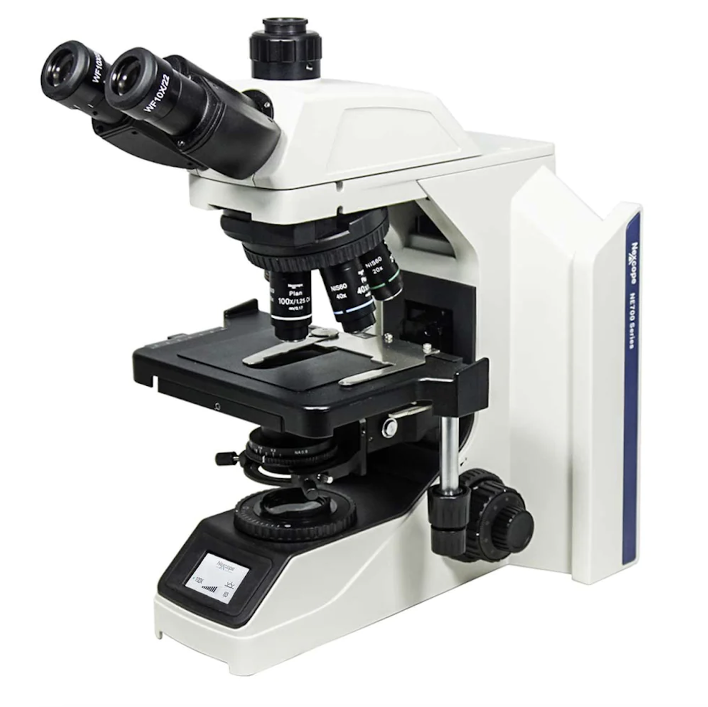 The NE700 is a clinical and research level microscope. Options include fluorescence, phase contrast, hoffman contrast and a wide range of excellent objectives.